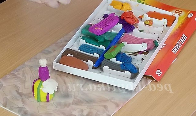 5. Вибираємо колір пластиліну для рукавів, невеликі грудочки пластиліну скачуємо кульки і приліплюваний до тулуба з боків.