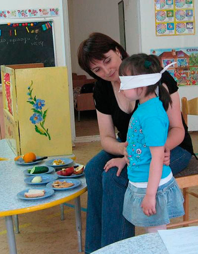 Наріжте в тарілку невеликі шматочки овочів і фруктів (яблуко, груша, слива, апельсин, огірок, морква, редис, ріпа тощо). Запропонуйте дитині закрити очі і розжувати який-небудь шматочок. Запитаєте, що це був за смак (солодкий, кислий, гіркий, солоний) і як називається те, що він їсть.