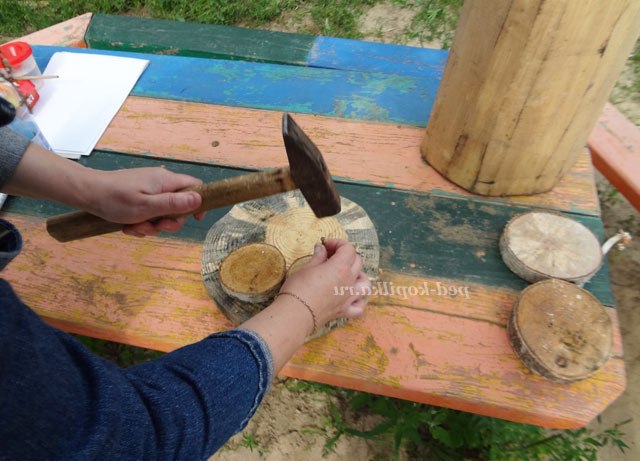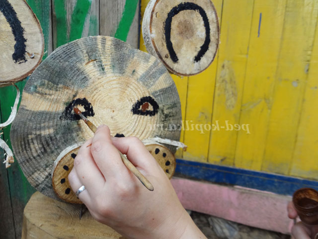 Тепер з'єднуємо мордочку з тулубом. Для цього беремо пенечек побільше і прибиваємо до нього готову мордочку.