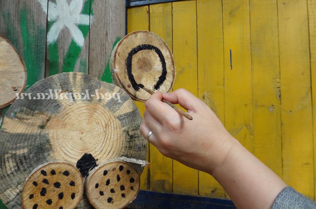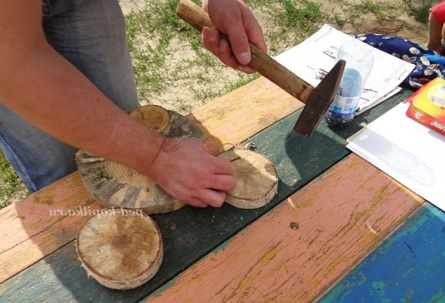 Для мордочки ведмедя беремо спіл (діаметром 40 см) і до неї прибиваємо цвяхами 2 спила (діаметром 10 см).