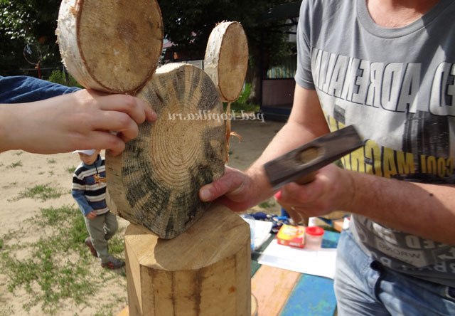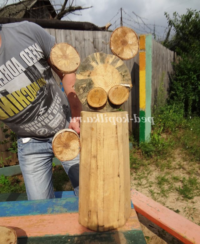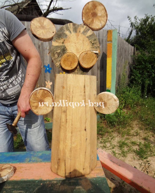 Потім робимо вушка ведмедя . Для цього до мордочці зверху прибиваємо два дерева (діаметром 15 див).