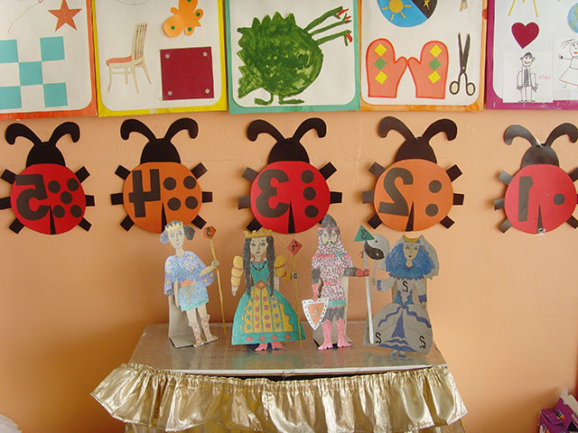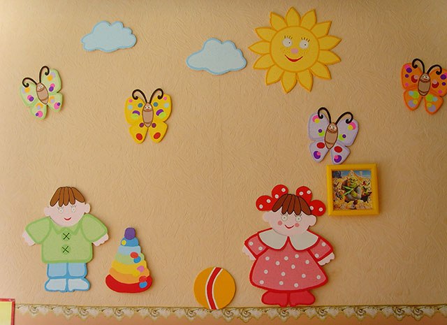 Оформлення «Наша група». Білочка і парасольку виконані з стельових плит, пофарбовані водоемульсійною фарбою з додаванням різнокольорових забарвлень.