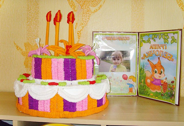 Для привітання дітей з днем народження виготовила торт зі свічками з гофрованого паперу.