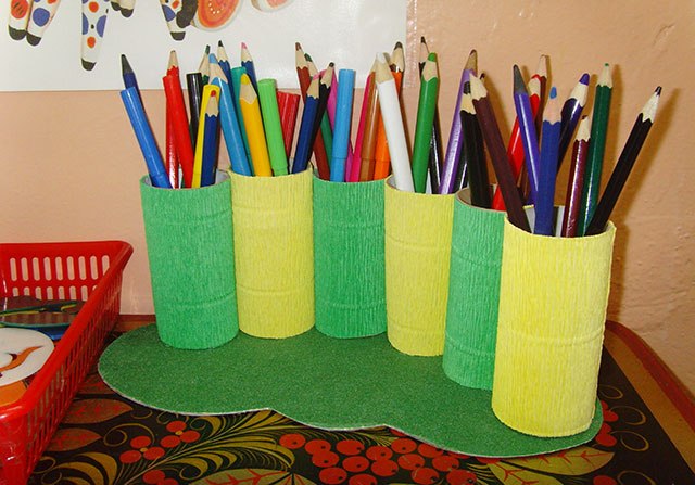 Дуже багато посібників роблю з непридатного матеріалу. Карандашница в куточок З (з рулончиків від туалетного паперу).