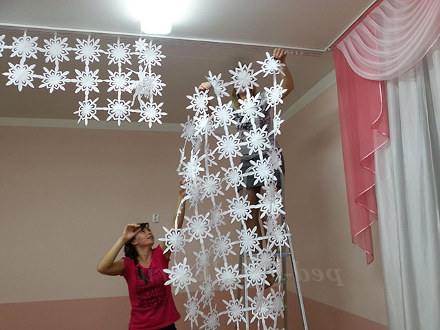 3. Вирізаємо дуже багато сніжинок для прикраси стіни зверху, маленькі сніжинки нанизуємо на нитку, створюємо композицію на стіні.