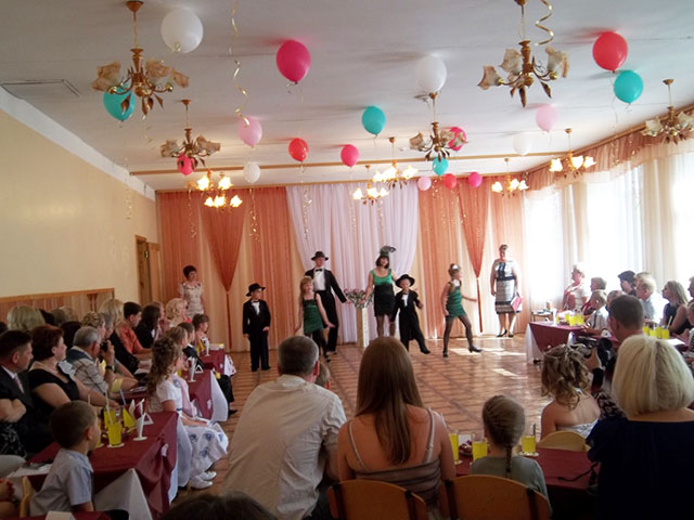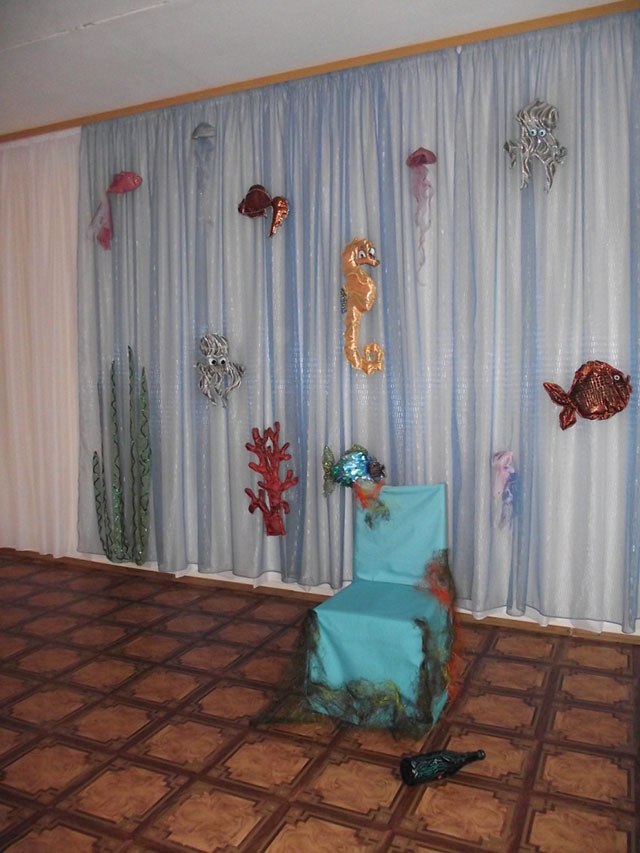 Риби і водорості зшиті з різної тканини і вишиті паєтками. Випускний у минулому році пройшов у формі телепередачі «Суботній вечір», тому акцент у залі зроблений не на центральну стіну, а на накриті столики, за якими сидять випускники та їх батьки. Хоча погодьтеся, що багатошарова драпірування і повітряні кулі створюють святковий настрій.