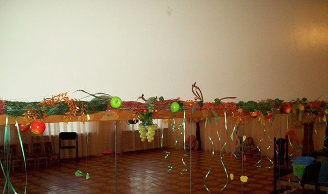 Осінь - прекрасний яскравий час року. Тому для оформлення музичної зали були використані не тільки повітряна вуаль різноманітних квітів, але і стрічки, фрукти, штучні гілки і листя, кольорова упаковка для квітів з кокосового волокна.