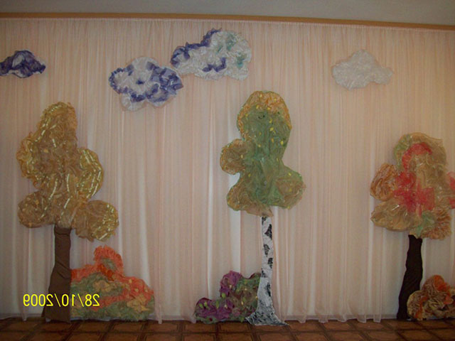 Осінь буває різною і тому в цьому навчальному році дерева в осінньому лісі я нашила прямо на тонку вуаль і розвісила полотна не тільки на центральній стіні, але і на додатковій гардини, призначеної для завіси, створивши тим самим відчуттів перспективи.