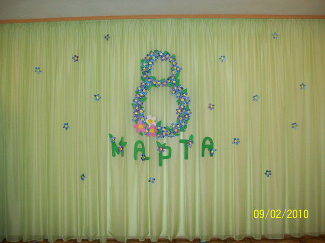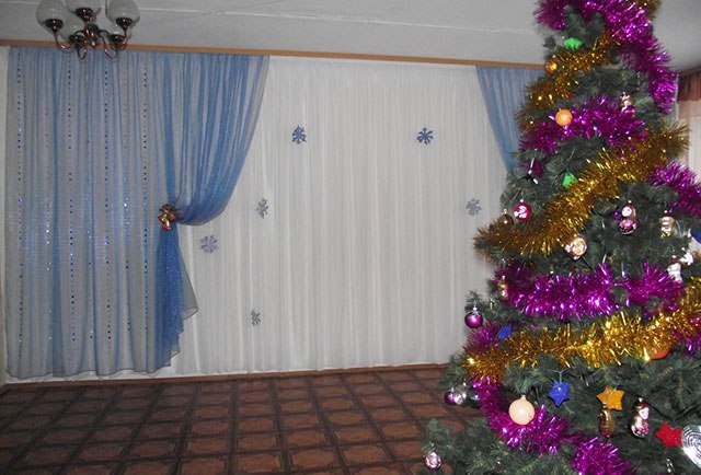 Оформляючи музичний зал до свят, я намагаюся передати святкову атмосферу заходу, зробити зал незабутнім, завжди різним і привабливим як для дітей, так і для дорослих. Останнім часом я використовую у своїй роботі тканина. Це довговічний матеріал, оформлення якого можна використовувати в різних варіаціях, змінюючи форму і зміст оформлення шляхом міксу вже готових елементів оформлення.