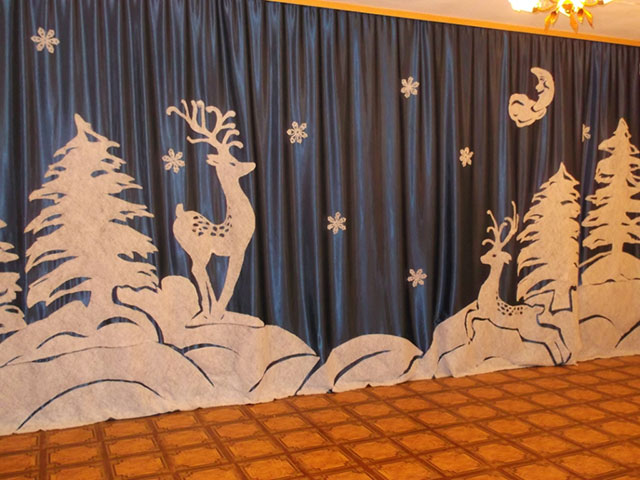 На Новий рік в цьому навчальному році я займалася виготовленням оформлення майже 2 місяці. До виготовлення фону довелося залучити педагогів нашого дошкільного закладу, тому потрібна велика робота по пришиванию сентепона на основну тканину, але по-моєму воно того варте!