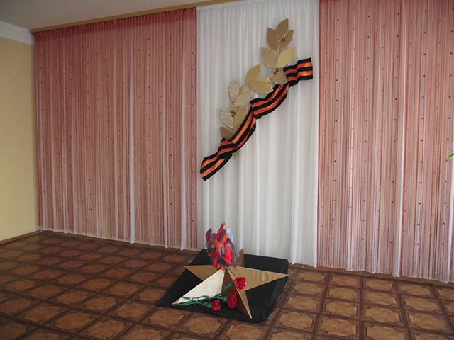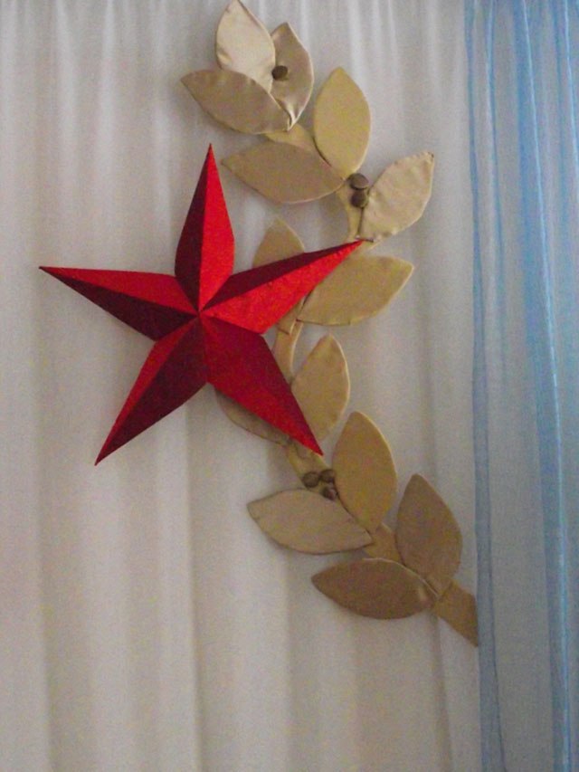 9 травня - це особлива дата. Щороку до нас у гості в дитячий садок приходять від 20 до 30 ветеранів, для яких ми готуємо святковий концерт, накриваємо столи. Завжди хочеться створити святкову атмосферу. Це оформлення було зібрано з частин. Гілка вже була використана на святі 23 лютого, а вічний вогонь виготовлений за аналогією з червоною зіркою, але великих розмірів. Ось що вийшло.