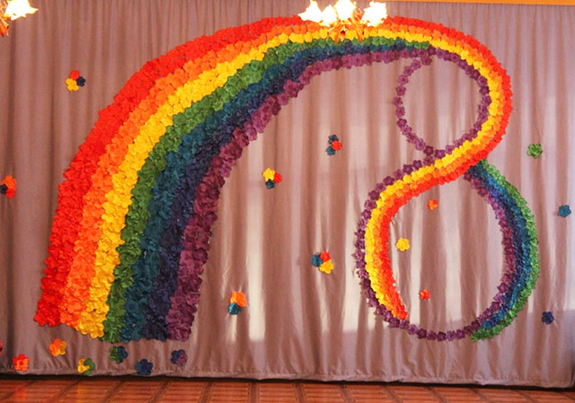 Цей рік був урожайним на ідеї і досить трудомістким для їх втілення. Довелося знову залучати колектив для допомоги в пришивання 1500 квіток і перетворення усього цього пишноти в веселку. Квіти шилися з мого улюбленого крап сатину на протязі 1,5 місяців.