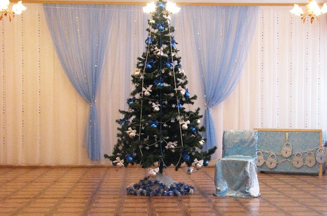 Через рік концепція залу повністю змінилася, ялинка стала не такою строкатою, її як і весь зал, ми витримали в сріблясто-синій гамі. Якщо ви помітили, то центральна стіна прикрашена все тієї ж органзою і вуаллю, тільки на цей раз вона по іншому задрапірована, а до синіми нитками дзеркал додалися срібні. Ну і звичайно ж скриня, який оббитий парчею. Замки, як і ключі до них виготовлені на замовлення в майстерні з товстого пластика і вкриті срібною плівкою.