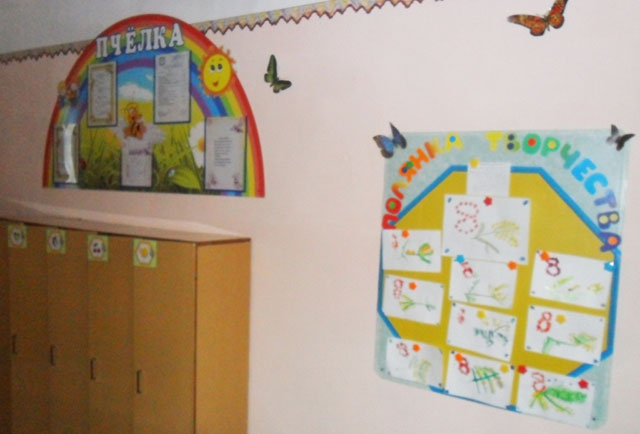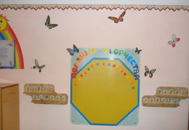 Стенд прикріплюється до стіни за допомогою саморізів. Щоб не було видно капелюшків саморізів, я на них приклеїла метеликів. По боках стенду, який я назвала "Полянка творчості", так само за допомогою саморізів, прикріпила до стіни полички для виставлення дитячих робіт, виконаних з пластиліну. І стенд, і полички розташовані на рівні дітей, щоб вони могли самостійно розміщувати свої роботи.
