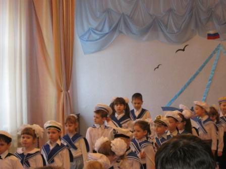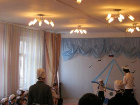 Обладнання. Модель корабля, костюми моряків (на кожну дитину), костюми для дорослих (капітан і боцман), бінокль, дзвін, швабра (1 шт), плоскі моделі риби, картопля (6 шт.), вудка (2 шт.), казанок (2 шт.), ножі (2 шт.), пляшка (посудину) із завданнями для морського іспиту, якоря (2 шт.), картки з літерами «ВІТАЄМО ЗІ СВЯТОМ», сувеніри для тат, дідусів і братів і дітей-учасників.