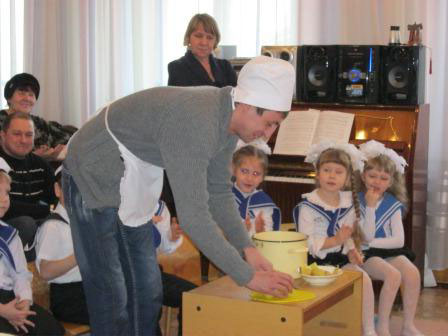 А кухарями ми виберемо ваших пап. Шановні тата, хто хоче нам допомогти зварити юшку? (Боцман допомагає вибрати 2-х пап).