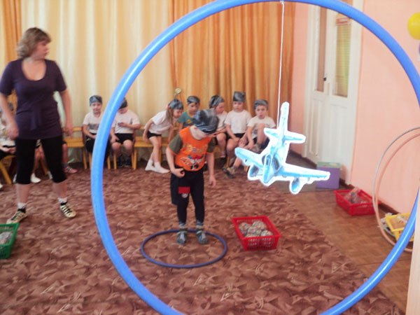 (ворожий літак з паперу підвішений в середині обруча, снаряди - маленькі м'ячі)