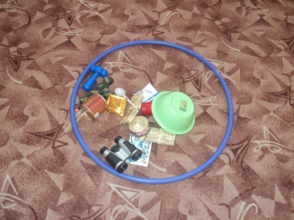 По команді треба зібрати рюкзак з одного предмету, але тут є ще зайвий предмет - уважний солдатів зайвого не візьме, а все потрібне не пропустить. Коли наплечники готові - промарширувати з ним цілий круг!