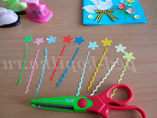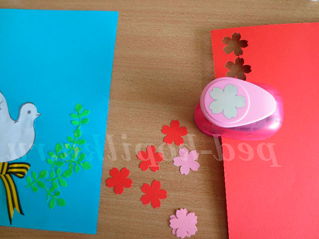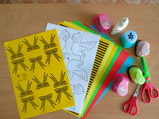 Необхідні матеріали та інструменти: аркуш кольорового картону (для основи), кольоровий папір (можна використовувати папір для ксерокса), аркуші з роздрукованими деталями і написом «З Днем Перемоги!», клей ПВА, пензлик, ножиці прості та фігурні дироколи фігурні.