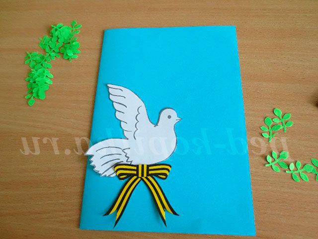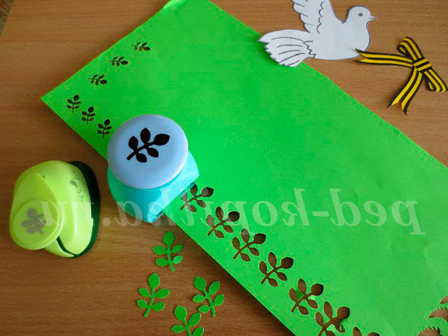 Вирізаємо роздруковані деталі (фігура голуба, георгіївська стрічка). Використовуючи фігурні дироколи, вирізаємо зелене листя для композиції.