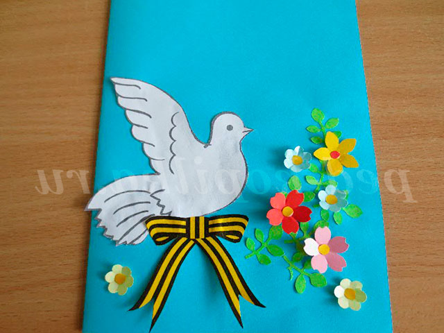 Починаємо складати композицію: наклеюємо голуба, георгіївську стрічку.