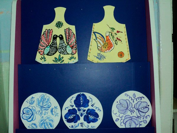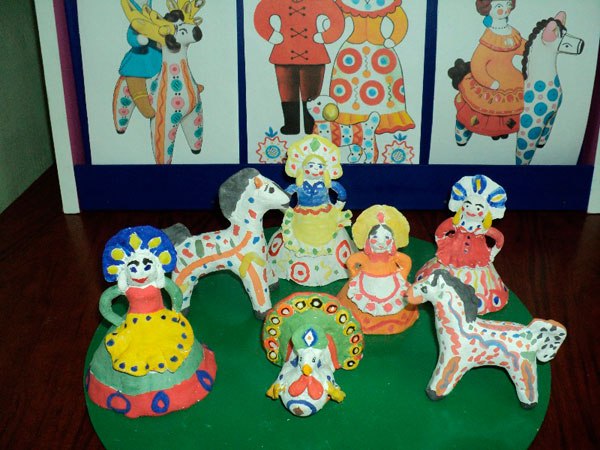 - Умільці, кажеш? А це ми зараз перевіримо , які вони умільці. Розпишіть ці предмети використовуючи елементи дымковской, городоцької та гжельской розписів. (батькам надаються об'ємні моделі дымковских іграшок і вирізані з фанери або ДВП обробні дошки, попередньо тоновані)