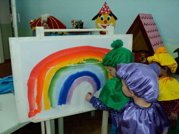 Давайте уявимо, що зараз йде дощ. Ви сидите біля вікна, дивіться і слухати шум дощу. І ви, напевно, почуєте різні звуки, різні голоси. (Входять діти в костюмах фарбочок)