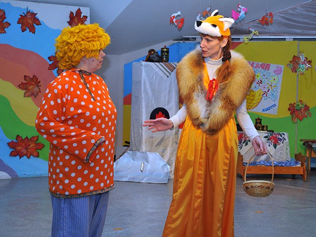 Лисиця тікає за Колобком за ширму.