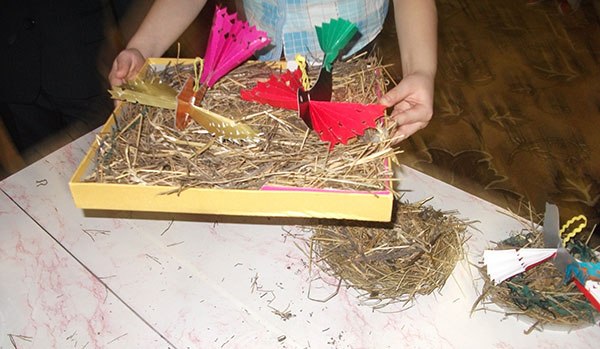 Пташок даруємо гостям , гніздечка розставляємо , пташок з пластиліну садимо в гніздечка