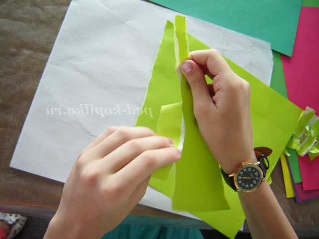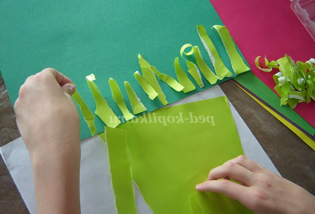 Необхідно підібрати листи зеленого паперу різних відтінків. Потім в ліву руку беремо аркуш паперу, а правою - зверху вниз обриваємо смужку. Виходить травинка. Таких смужок потрібно нарвати багато різних розмірів і конфігурацій.