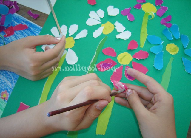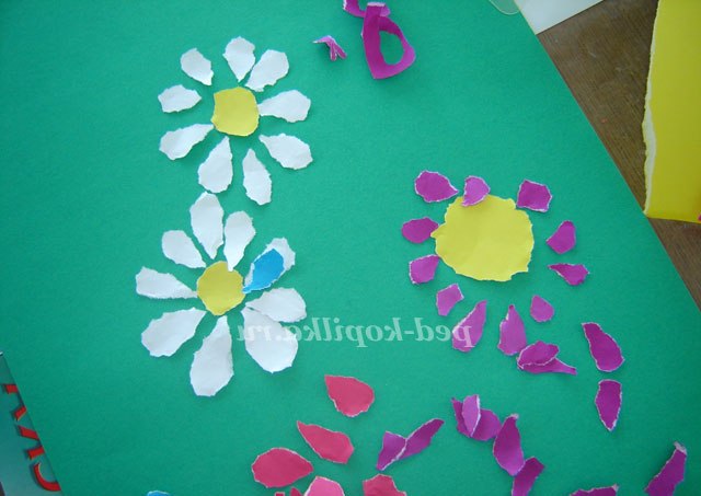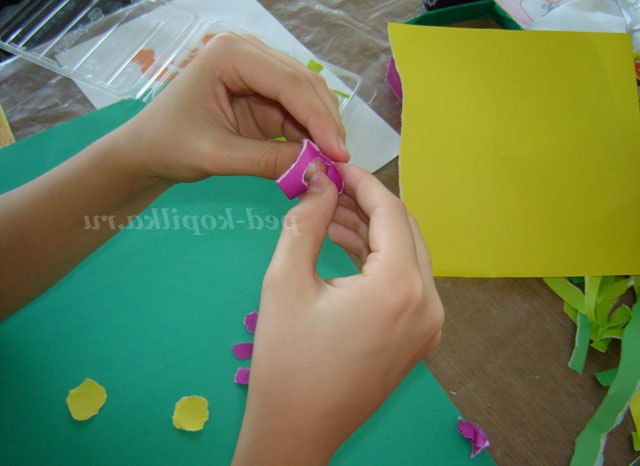 Найскладнішим у цій роботі є способом обриву папери зробити пелюстки для квітів у формі крапельок, а серединки - у формі маленьких кружечків.