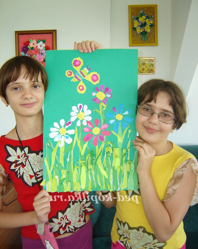 Потім всі деталі приклеюємо за допомогою пензлика. Травинки намазує клеєм тільки біля основи, щоб у подальшому на готовій роботі вони виглядали як справжні. Підкручуємо кінчики травинок олівцем або ножицями. За допомогою фарб і пензлика при необхідності можна промальовувати дрібні деталі квітів, метеликів, жуків і т.д.