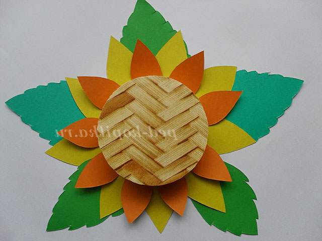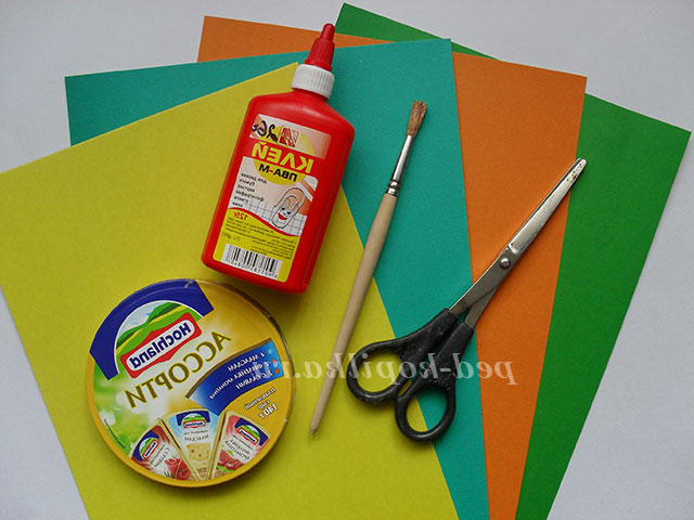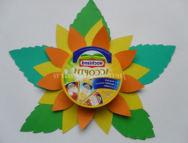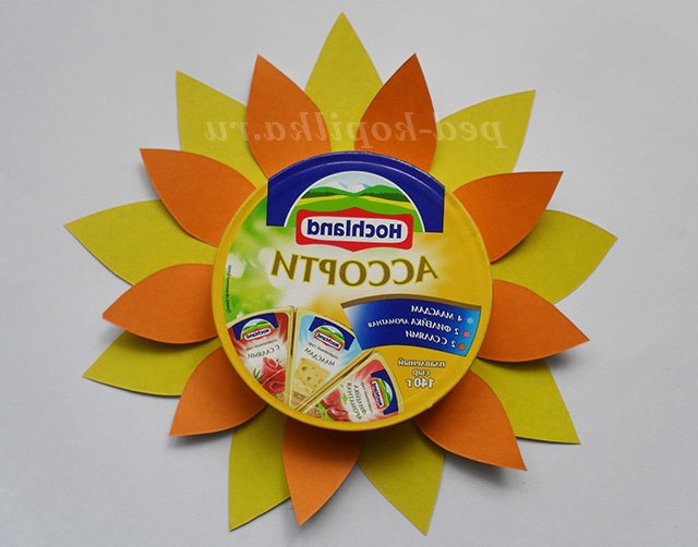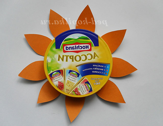 1. Візьміть аркуш помаранчевого картону, намалюйте 9 пелюсток і запропонуйте дитині вирізати їх. З допомогою клею ПВА і пензлики, наклейте пелюстки на коробочку від сиру із зворотного боку.