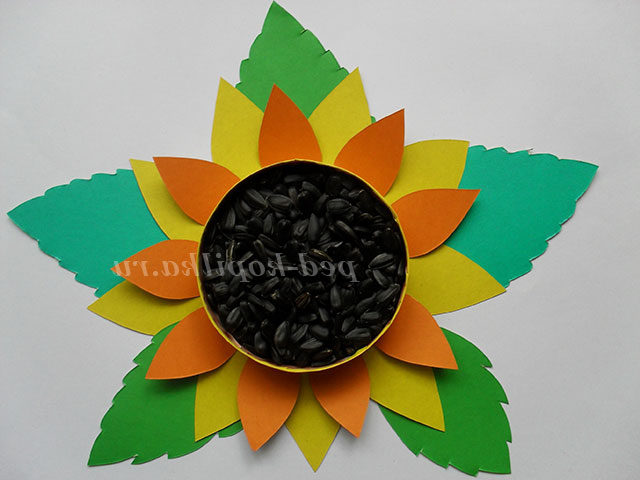 5. Налийте клей всередину відкритої коробочки, запропонуйте дитині рівномірно розмазати його пензликом, а потім посипати насінням соняшнику. Трохи притисніть насіння і залиште, щоб виріб висохла.