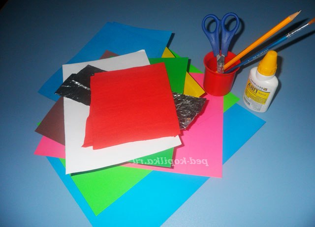 Обладнання: клей ПВА, олівець, ножиці, фольга, пів аркуша білого кольору, картон (зелений, синій, червоний), кольоровий папір (синя, жовта, коричнева, червона, зелена), гофрована червона папір.