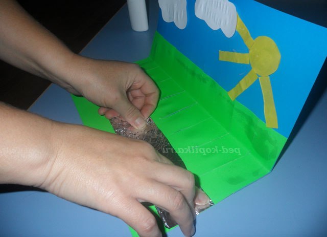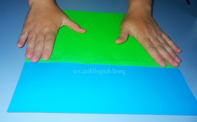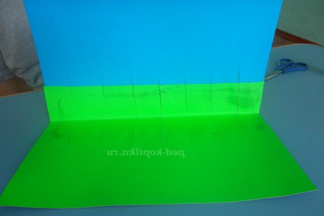 1) Приклей до синьої половині аркуша зелений картонний аркуш.