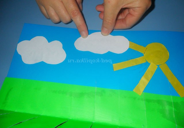 3) Намалюй і виріж з білого паперу хмари, а з жовтою сонце. На блакитну частину приклей все це. У тебе вийшло небо.