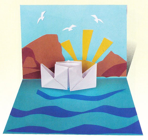 Запропонуйте дітям оформити внутрішню частину картинки: намалювати сюжет за своїм бажанням, зробити аплікацію або розфарбувати запропоновану картинку. Лінія згину листівки умовно ділить картину на небо і море. На тлі моря можна приклеїти привітання (2).