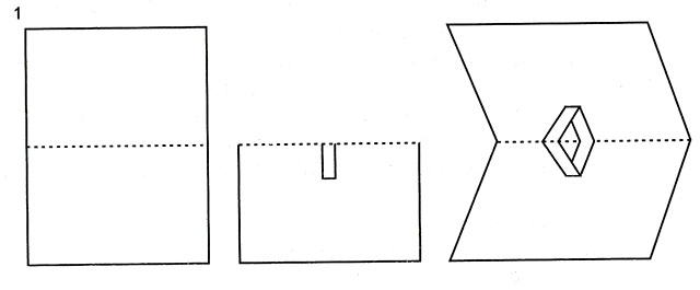 Складіть основу листівки навпіл і з боку згину зробіть надрізи двома паралельними лініями довжиною 4 - 5 см, відстань між лініями 2,5 див. Відкрийте лист і прогніть надрізану смугу всередину листівки - це підставка для пароплава (1).