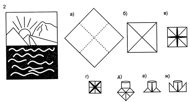 Для виготовлення пароплава приготуйте квадратний аркуш кольорового або білого паперу. Складіть лист два рази навпіл, щоб вийшов маленький квадрат. Розгорнувши квадрат, на перетині згинів ви побачите середину аркуша (а), до якої треба акуратно прикласти куточки і добре пропрасувати по згину (б).