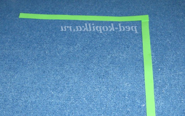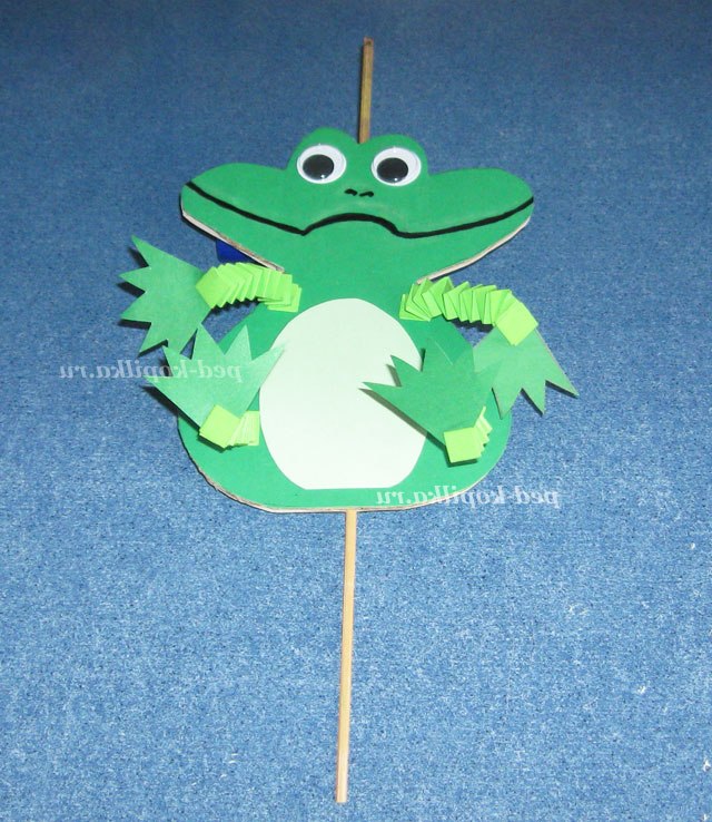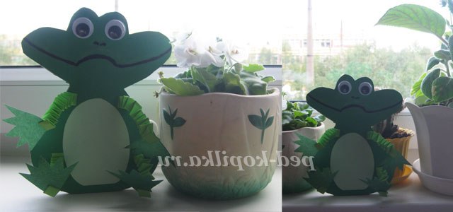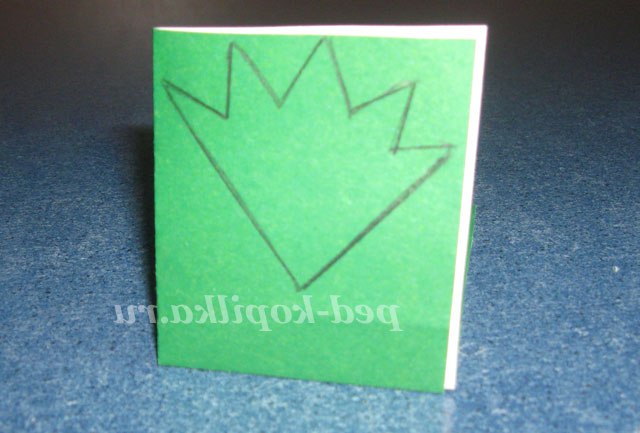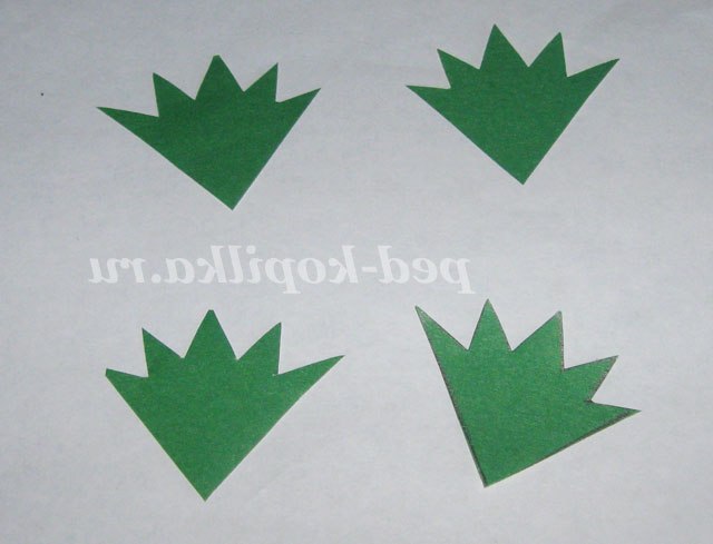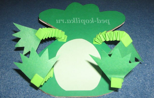Складаємо папір зеленого кольору малюємо на ній лапку жаби, вирізаємо. Повинно вийти 4 штуки.