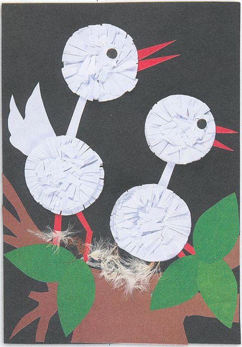 6. Приклейте птахам довгі дзьоби і ніжки з червоного паперу.