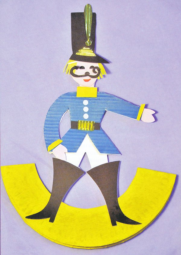 З кольорового паперу підготуйте деталі голови, рук, головного убору, одягу, чобіт. Закріпіть деталі на білому силуеті. Фломастерами намалюйте очі, ніс, вуса, рот. Верхню частину фігурки солдата промажте клеєм ПВА, прикладіть другий (білий) силует. Зачекайте, поки клей підсохне.