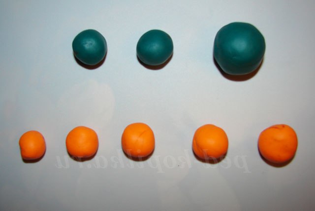 1. Розділити жовтий пластилін на п'ять частин різних за величиною, і скачати з них кульки. Зелений пластилін розділити на три частини (одна велика і дві рівні поменше) і так само скачати в кульки.