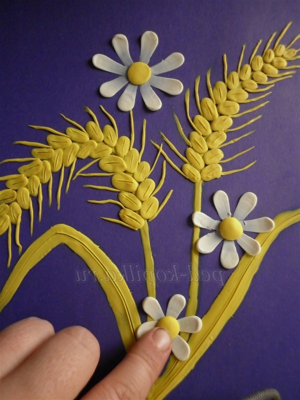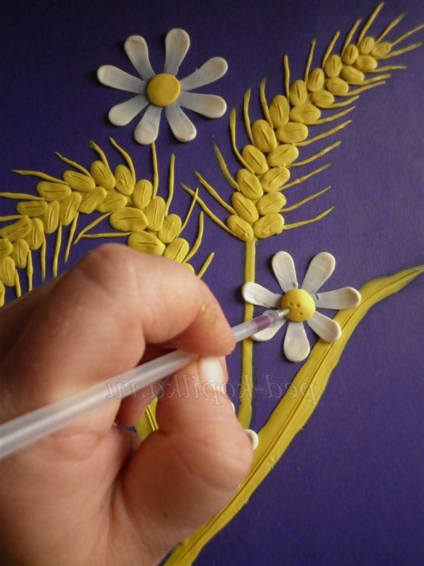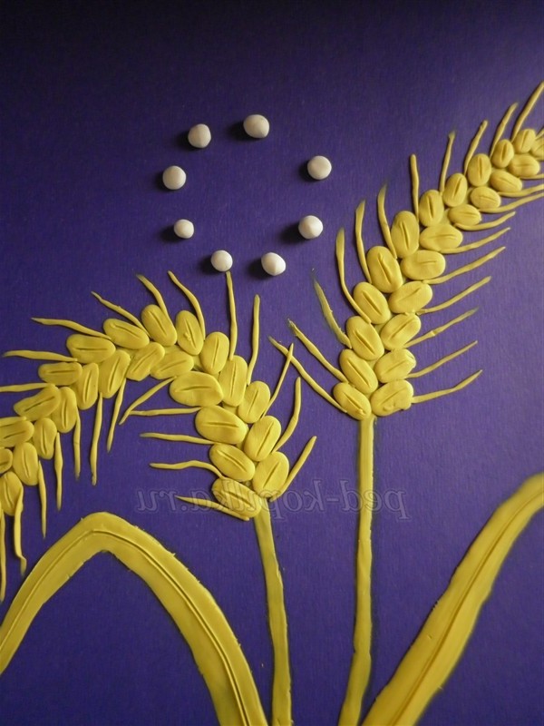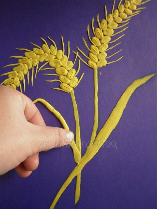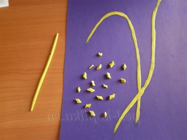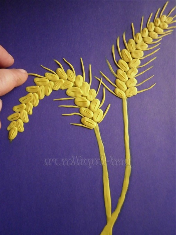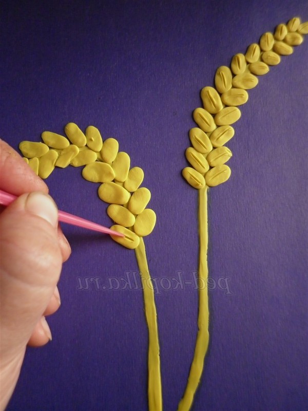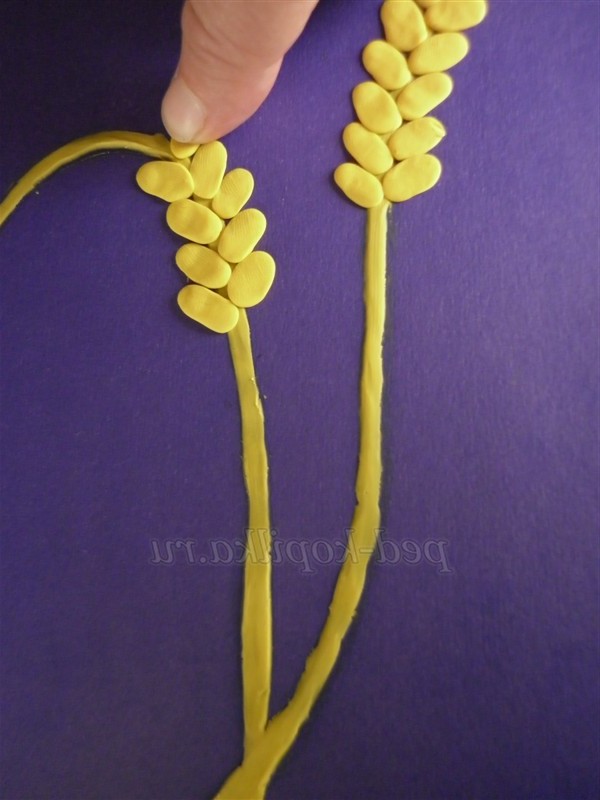 Скачати дуже тонкі ковбаски з жовтого пластиліну довжиною 2 -3 см - це будуть остья, які потрібно розташувати між зернами, направляючи їх до вершини колоса.