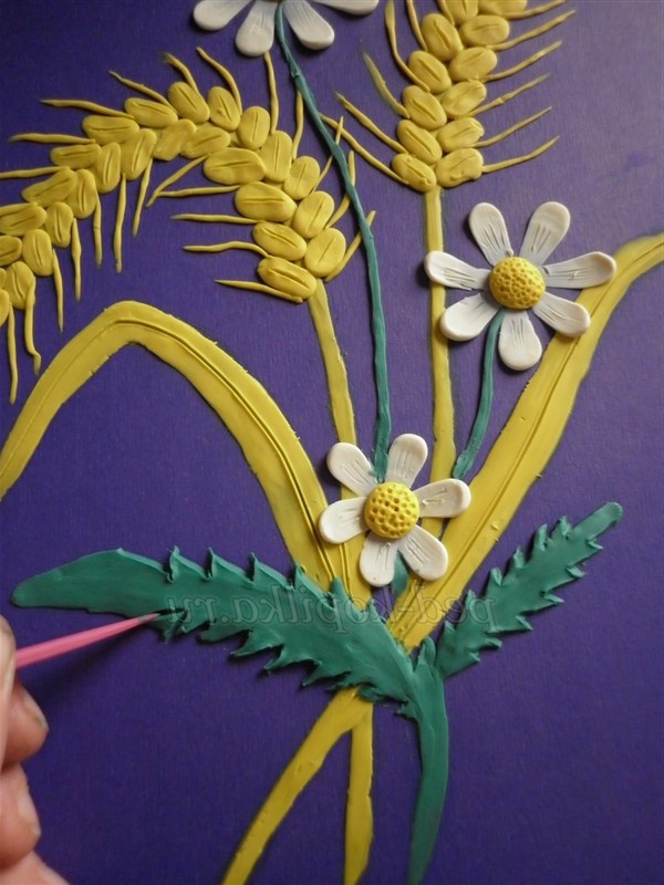 З пластиліну зеленого кольору скачуємо довгу ковбаску - стебло квітки, притиснути її до тла. З цього ж пластиліну формуємо листя і з допомогою стеки вирізаємо « зубчики», характерні листку ромашки і « малюємо» прожилки.