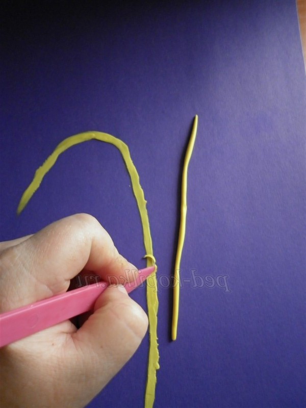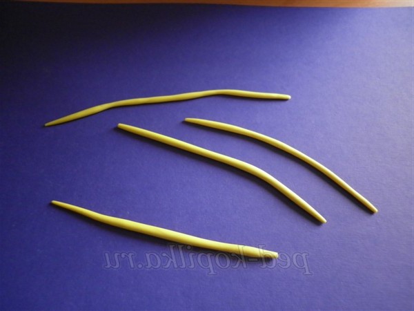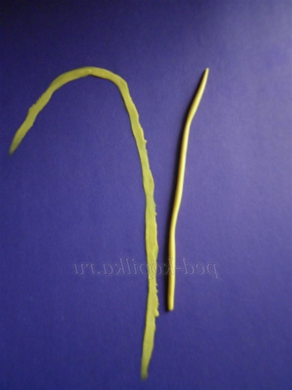 З тонких довгих жовтих ковбасок формуємо листя. Спочатку їх треба притиснути, а потім трохи розмазати, зробивши плоскими.