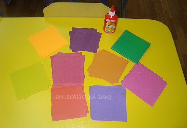 Квадрати з кольорового паперу;