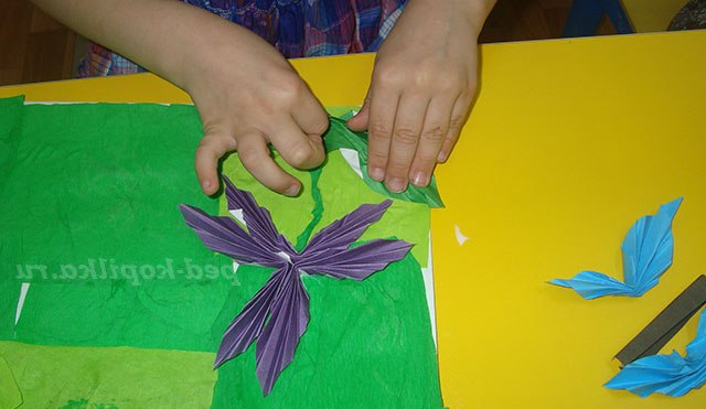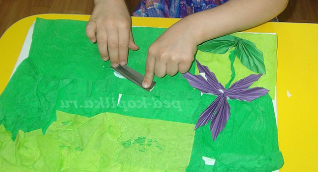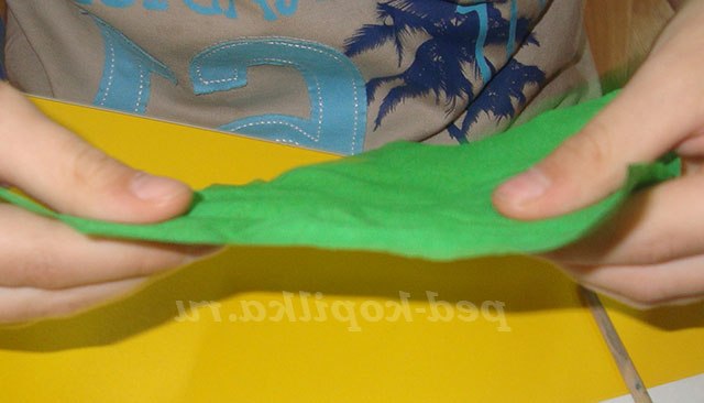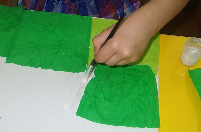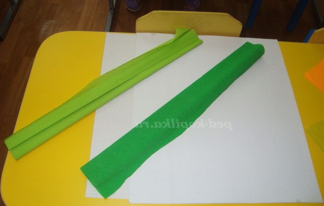 Фон робимо з гофрованого паперу. Папір розтягуємо, основу намазуємо клеєм і приклеюємо гофрований папір трохи стискаючи її, виходить трава.