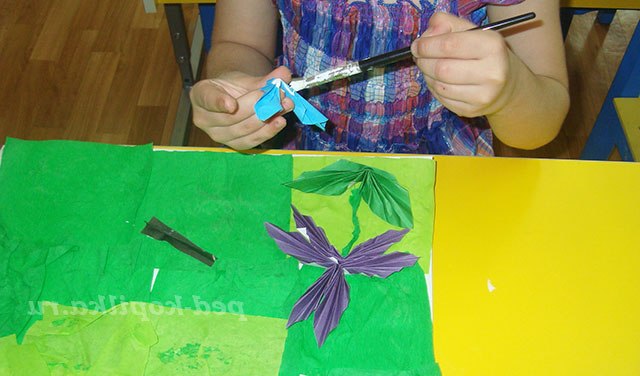 Розкладаємо квіти і метеликів і приклеюємо.